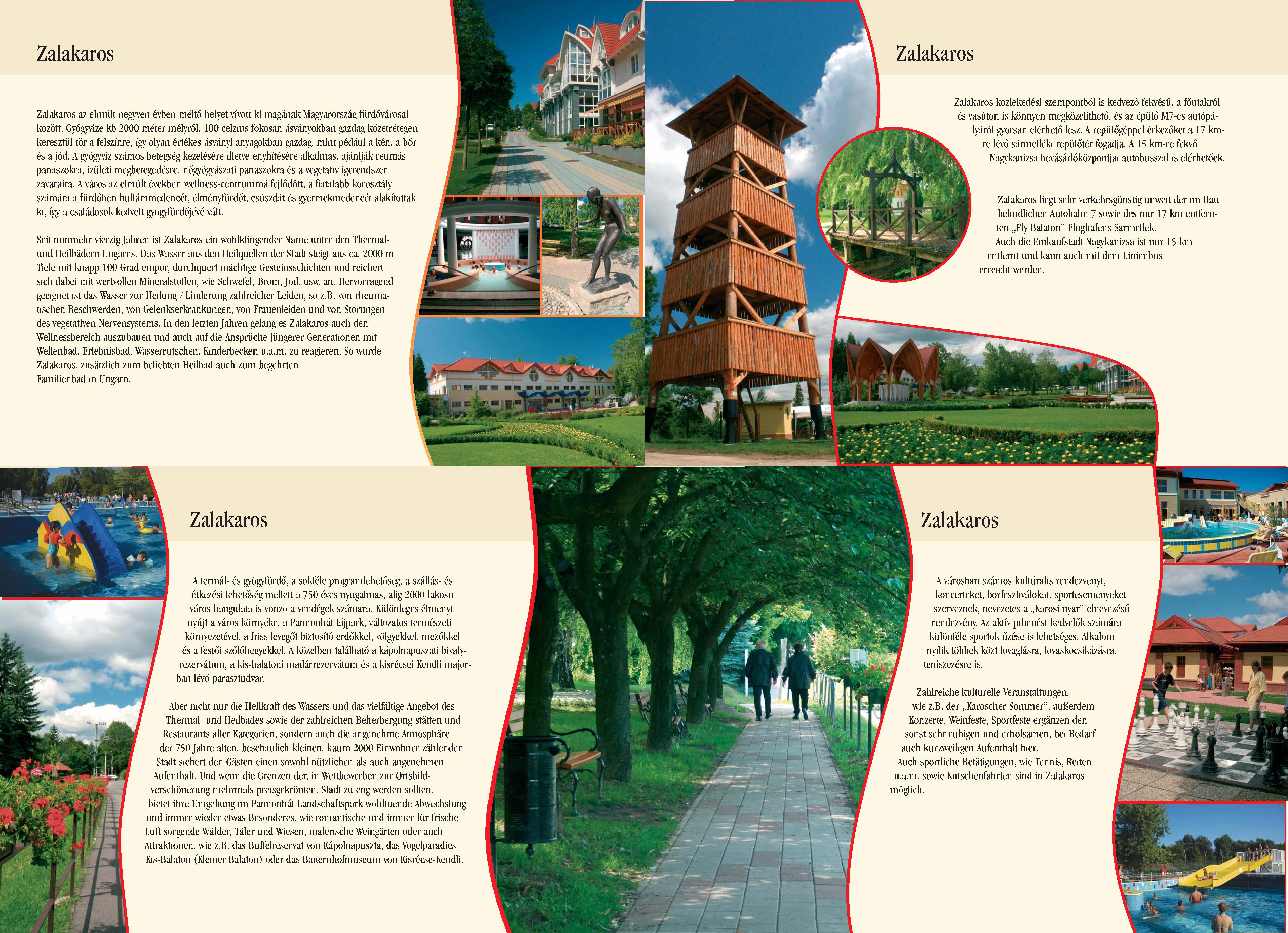Nyilvános 1822 | 5443 | Zalakaros | Seit nunmehr vierzig Jahren ist Zalakaros ein wohlklingender Name unter den Thermal- und Heilbädern Ungarns. Das Wasser aus den Heilquellen der Stadt steigt aus ca. 2000 m Tiefe mit knapp 100 Grad empor, durchquert mächtige Gesteinsschichten und reichert sich dabei mit wertvollen Mineralstoffen, wie Schwefel, Brom, Jod, usw. an. Hervorragend geeignet ist das Wasser zur Heilung / Linderung zahlreicher Leiden, so z.B. von rheumatischen Beschwerden, von Gelenkserkrankungen, von Frauenleiden und von Störungen des vegetativen Nervensystems. In den letzten Jahren gelang es Zalakaros auch den Wellnessbereich auszubauen und auch auf die Ansprüche jüngerer Generationen mit Wellenbad, Erlebnisbad, Wasserrutschen, Kinderbecken u.a.m. zu reagieren. So wurde Zalakaros, zusätzlich zum beliebten Heilbad auch zum begehrten Familienbad in Ungarn. Aber nicht nur die Heilkraft des Wassers und das vielfältige Angebot des Thermal- und Heilbades sowie der zahlreichen Beherbergung-stätten und Restaurants aller Kategorien, sondern auch die angenehme Atmosphäre der 750 Jahre alten, beschaulich kleinen, kaum 2000 Einwohner zählenden Stadt sichert den Gästen einen sowohl nützlichen als auch angenehmen Aufenthalt. Und wenn die Grenzen der, in Wettbewerben zur Ortsbild-verschönerung mehrmals preisgekrönten, Stadt zu eng werden sollten, bietet ihre Umgebung im Pannonhát Landschaftspark wohltuende Abwechslung und immer wieder etwas Besonderes, wie romantische und immer für frische Luft sorgende Wälder, Täler und Wiesen, malerische Weingärten oder auch Attraktionen, wie z.B. das Büffelreservat von Kápolnapuszta, das Vogelparadies Kis-Balaton (Kleiner Balaton) oder das Bauernhofmuseum von Kisrécse-Kendli. Zahlreiche kulturelle Veranstaltungen, wie z.B. der ,,Karoscher Sommer", außerdem Konzerte, Weinfeste, Sportfeste ergänzen den sonst sehr ruhigen und erholsamen, bei Bedarf auch kurzweiligen Aufenthalt hier. Auch sportliche Betätigungen, wie Tennis, Reiten u.a.m. sowie Kutschenfahrten sind in Zalakaros möglich. Zalakaros liegt sehr verkehrsgünstig unweit der im Bau befindlichen Autobahn 7 sowie des nur 17 km entfernten ,,Fly Balaton" Flughafens Sármellék. Auch die Einkaufstadt Nagykanizsa ist nur 15 km entfernt und kann auch mit dem Linienbus erreicht werden. Dieses Text stammt von: Pannonhát tájpark prospektus 2006. Web: http://www.pannonhat.hu/ (auch in Deutsch) |