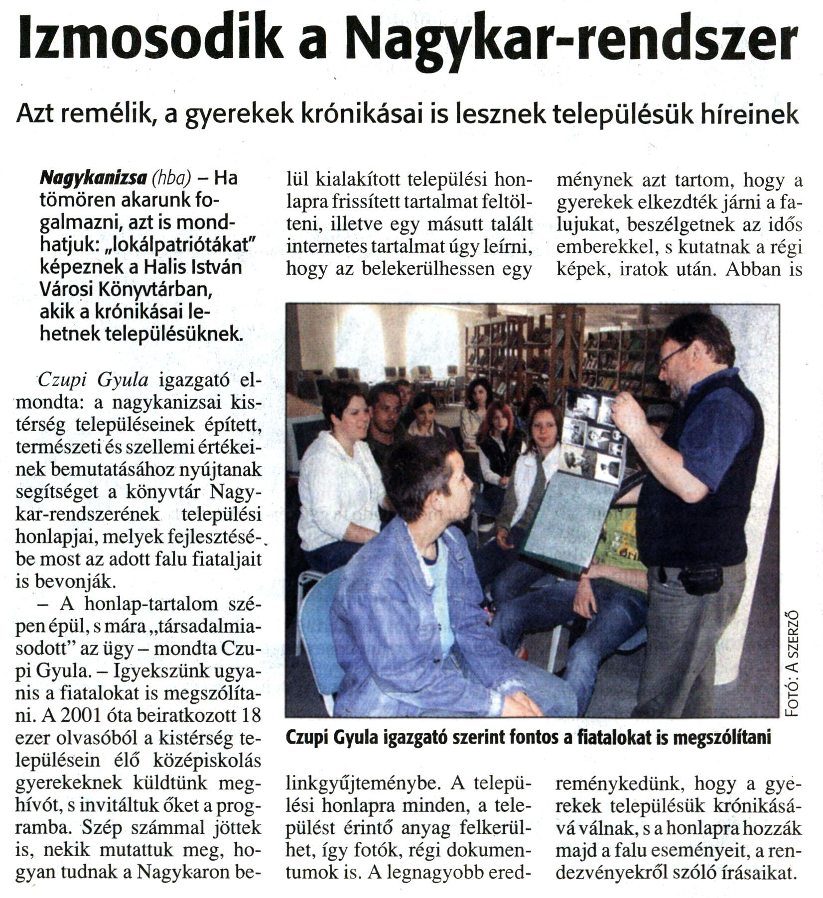 Nyilvános 13668 | 27487 | Rövid leírás | Teljes leírás (1.84 KB) | Zalai Hírlap 2008. június 9. 133. szám 12. oldal - Izmosodik a Nagykar-rendszer A cikk szövege: Izmosodik a Nagykar-rendszer Azt remélik, a gyerekek krónikásai is lesznek településük híreinek Nagykanizsa (hba) - Ha tömören akarunk fogalmazni, azt is mondhatjuk: „lokálpatriótákat" képeznek a Halis István Városi Könyvtárban, akik a krónikásai lehetnek településüknek. Czupi Gyula igazgató elmondta: a nagykanizsai kistérség településeinek épített, természeti és szellemi értékeinek bemutatásához nyújtanak segítséget a könyvtár Nagykar-rendszerének települési honlapjai, melyek fejlesztésébe most az adott falu fiataljait is bevonják. - A honlap-tartalom szépen épül, s mára „társadalmiasodott" az ügy - mondta Czupi Gyula. - Igyekszünk ugyanis a fiatalokat is megszólítani. A 2001 óta beiratkozott 18 ezer olvasóból a kistérség településein élő középiskolás gyerekeknek küldtünk meghívót, s invitáltuk őket a programba. Szép számmal jöttek is, nekik mutattuk meg, hogyan tudnak a Nagykaron belül kialakított települési honlapra frissített tartalmat feltölteni, illetve egy másutt talált internetes tartalmat úgy leírni, hogy az belekerülhessen egy linkgyűjteménybe. A települési honlapra minden, a települést érintő anyag felkerülhet, így fotók, régi dokumentumok is. A legnagyobb eredménynek azt tartom, hogy a gyerekek elkezdték járni a falujukat, beszélgetnek az idős emberekkel, s kutatnak a régi képek, iratok után. Abban is reménykedünk, hogy a gyerekek településük krónikásává válnak, s a honlapra hozzák majd a falu eseményeit, a rendezvényekről szóló írásaikat. Képaláírás: Czupi Gyula igazgató szerint fontos a fiatalokat is megszólítani |